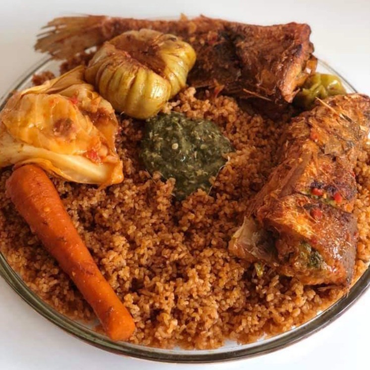 Ingrédients : 500 g de riz cassé, 1 poisson entier (type thiof ou dorade), 2 carottes, 1 morceau de chou, 1 aubergine africaine, 1 oignon, 3 tomates, 2 c. à soupe de concentré de tomate, 3 gousses d’ail, 1 cube bouillon, sel, poivre, piment, huile, persil.