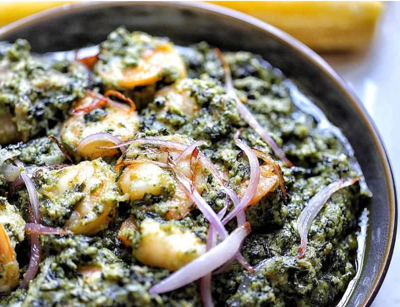 Ingrédients : 500 g de feuilles de ndolé (ou d’épinards comme substitut), 250 g de pâte d’arachide, 300 g de viande (ou crevettes), 1 oignon, 1 poignée d’arachides entières, huile, cube, piment, sel.